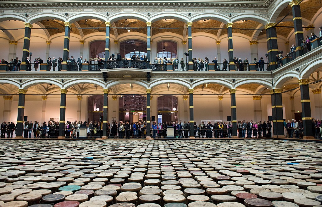 El patio de taburetes de "Stools" retoma las dimensiones y tema de "Soft Ground", el mosaico que Ai instaló en 2009 en el suelo del museo muniqués de la Haus de Kunst, cuya fachada cubrió por miles de mochilas de colores cómo símbolo de los niños muertos al derrumbarse sus escuelas por el terremoto de Sichuan.