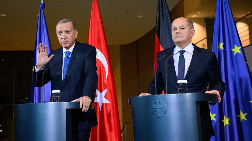 Erdogan llevaba tres años sin pisar Berlín. Han sido en este tiempo continuas las trifulcas bilaterales entre Turquía y Alemania, donde viven unos cuatro millones de personas de raíces turcas, el mayor colectivo de ciudadanos de origen extranjero de la potencia europea. Su reelección como presidente cayó como un jarro de agua fría al gobierno del socialdemócrata Scholz, que confiaba en un triunfo de la oposición para reencauzar las relaciones bilaterales.