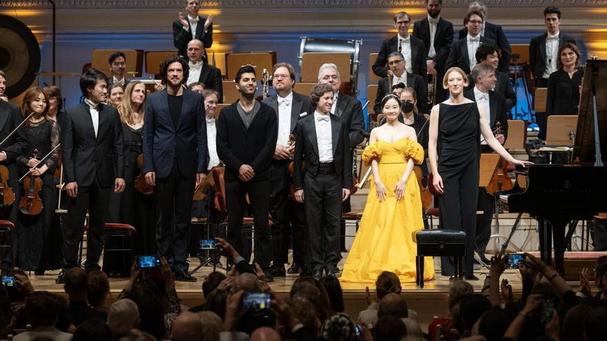 Bruce Liu; Andrè Schuen; Kian Soltani; Rafał Blechacz; Bomsori Kim y la directora de orquesta Joana Mallwitz, anoche en Berlín. /STEFAN HÖDERATHNoticias relacionadas