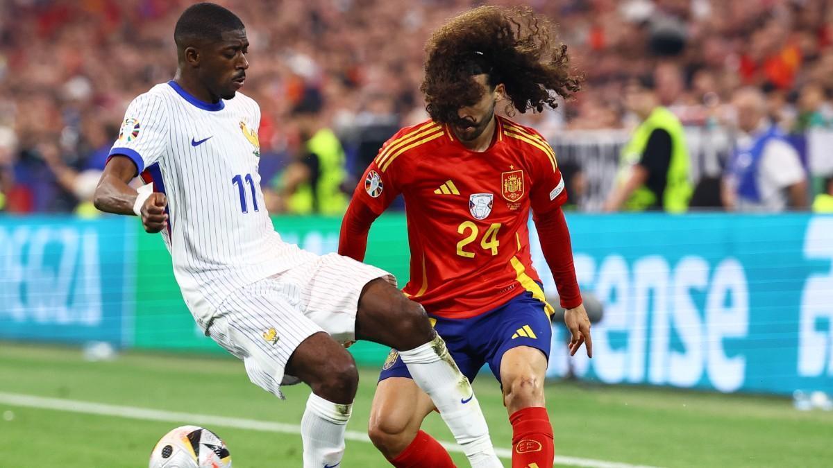 Cucurella disputa la posesión con Dembélé durante el España - Francia / EFE
