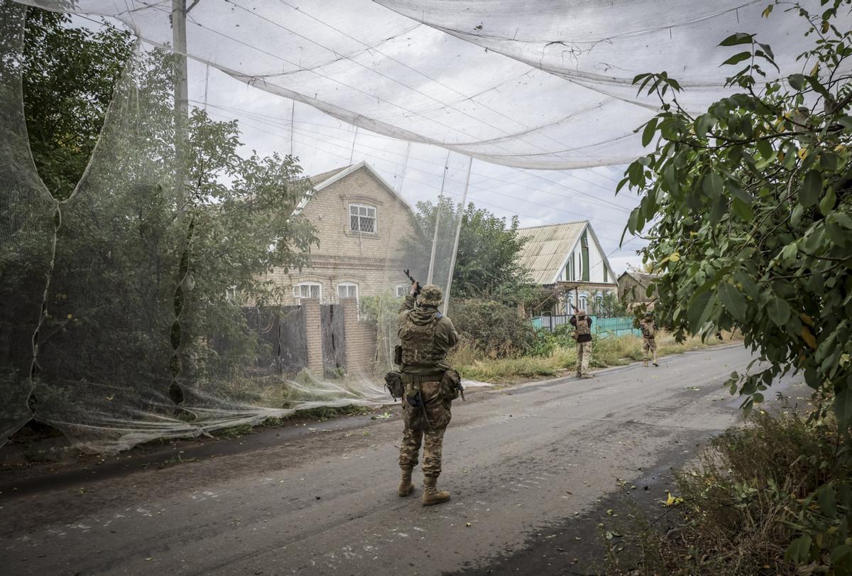 Soldados ucranianos instalan redes para protegerse de los drones en una zona del Donetsk. / EFE