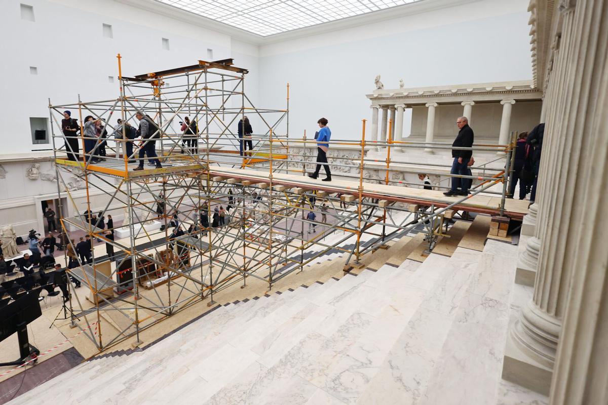 Andamios en el Gran Altar de Pérgamo, durante un recorrido para la prensa por las remodelaciones del afamado Museo de Pérgamo, en Berlín (Alemania). / HANNIBAL HANSCHKE / EFE