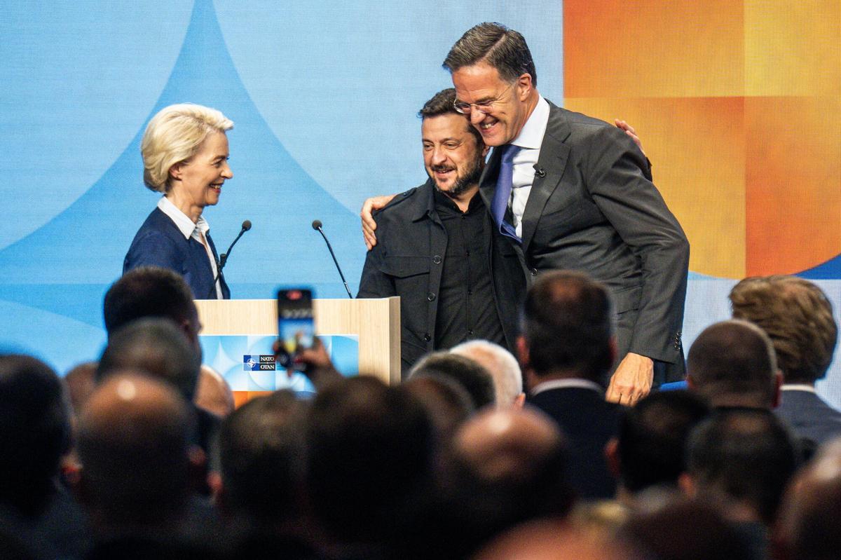 La presidenta de la Comisión Europea, Ursula von der Leyen, el presidente ucraniano, Volodymyr Zelensky, y el secretario general de la OTAN, Mark Rutte, se reúnen al inicio de una sesión plenaria del Foro de la Industria de Defensa de la Cumbre de la OTAN en La Haya/ JONAS ROOSENS / EFE