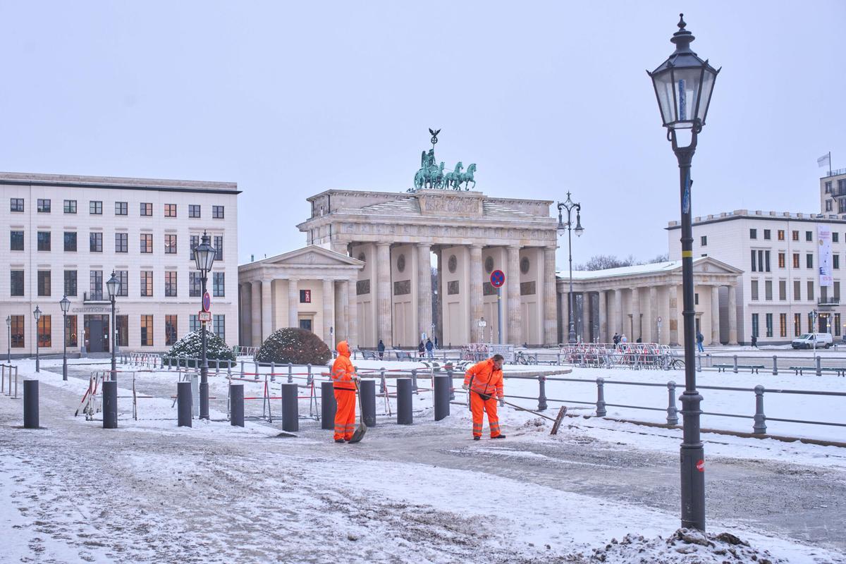 Trabajadores municipales limpian de nieve una calle cercana a la Puerta de Brandenburgo, en Berlín, este viernes. / MARKUS SCHREIBER / AP