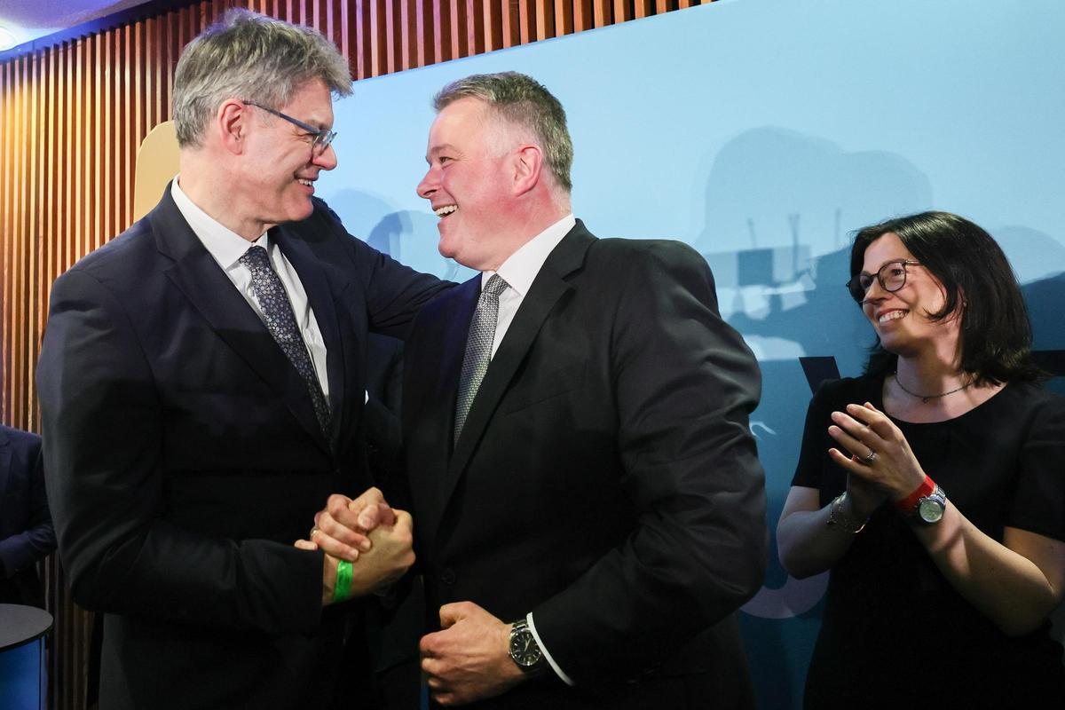 Candidato de la CDU para las elecciones estatales de Renania-Palatinado, Gordon Schnieder (C), abraza a su hermano, el ministro alemán de Transporte Patrick Schnieder (I) / RONALD WITTEK | EFE